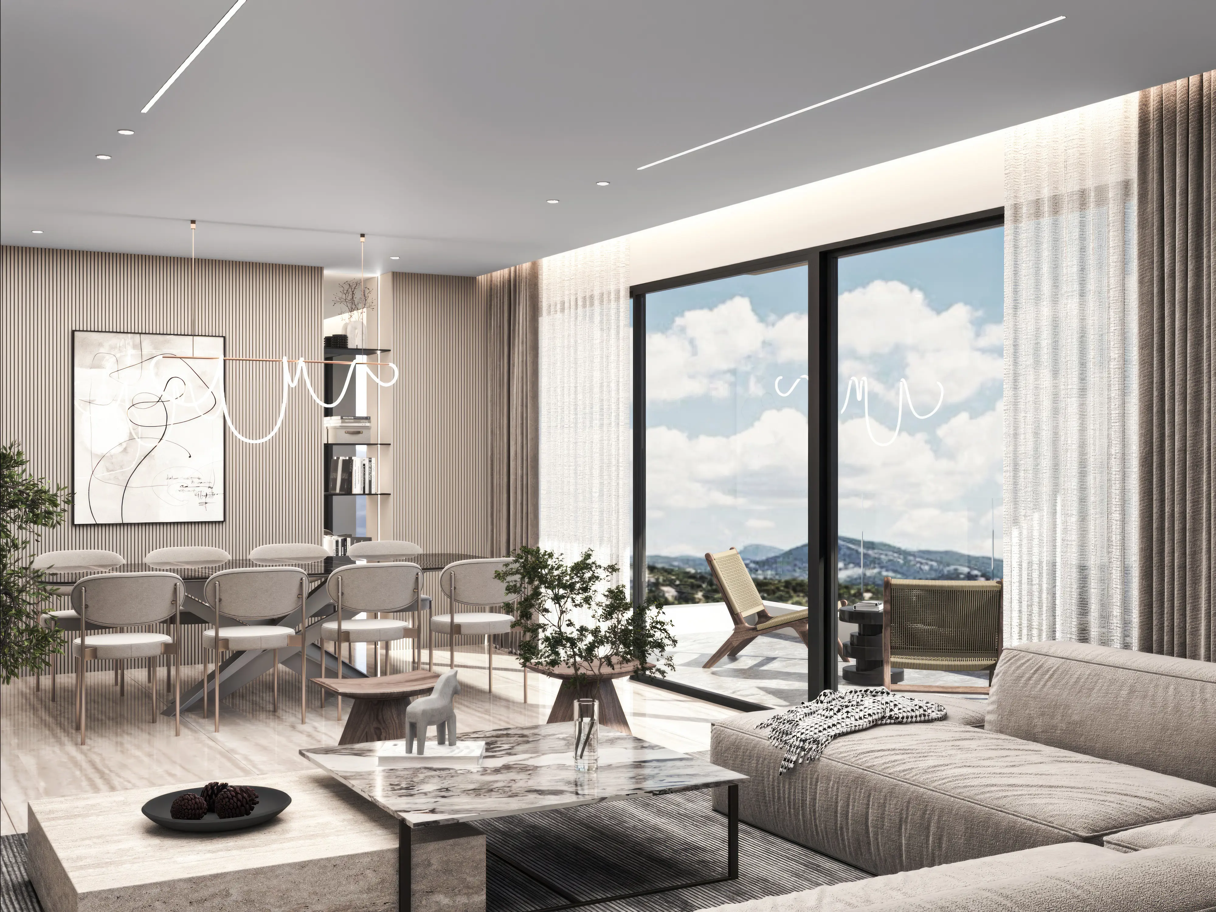 Residents are treated to breathtaking views of the mountains, providing an ideal backdrop to daily life. Inside, comfort is of prime importance, with the SIDEM 2000 double glazing system ensuring energy efficiency and tranquility within the apartments. When it comes to styling, premium ceramic tiles sourced from Spain and Italy are the highlight in living areas, bedrooms, bathrooms, and kitchens, with French oak doors adding a touch of warmth and luxury.