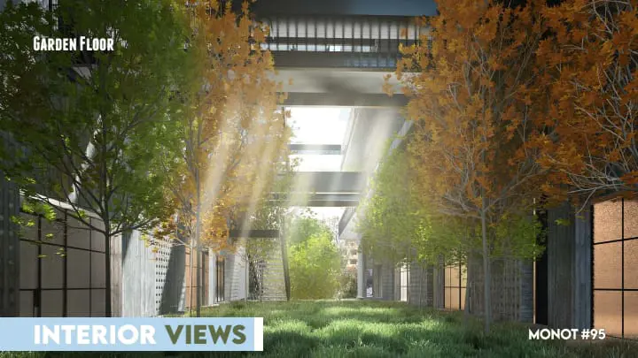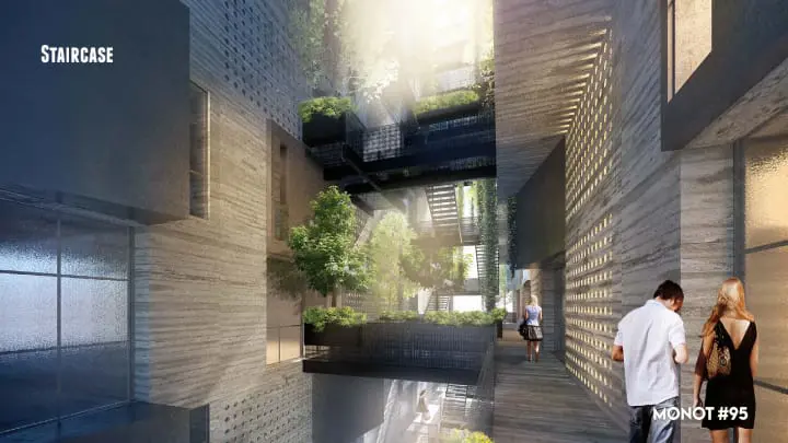 With an emphasis on openness, exchange and a sense of community, MONOT95 features an open stairway with natural light and ventilation, a central hall with high ceilings, several lush gardens, a sky pool, a gym and balconies opening up to the street on three sides, integrating the building with its surrounding urban environment.