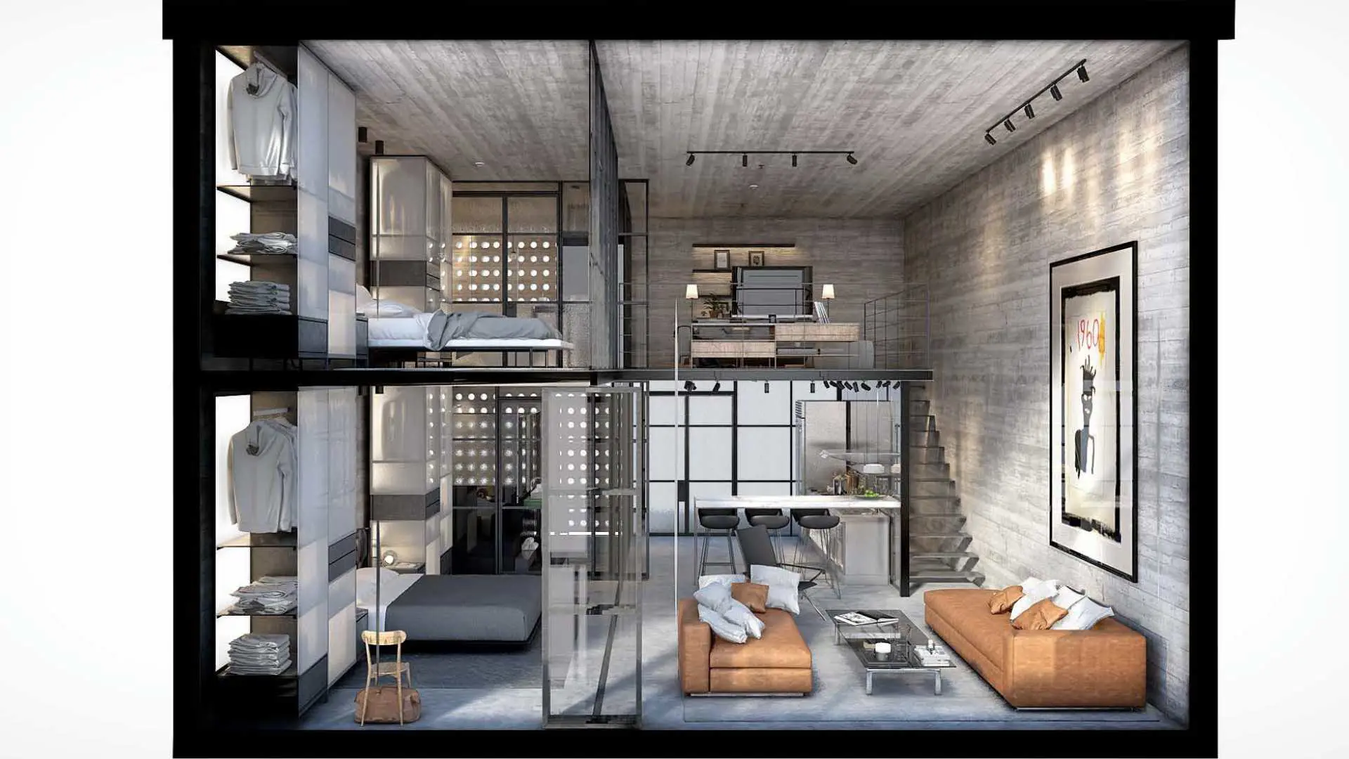 Inside, duplex apartments, ranging from 77 to 220 square meters, are characterized by a timeless style, incorporating elements of concrete, wood, and steel.